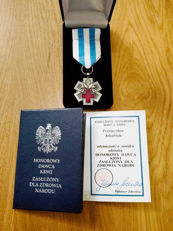 Honorowy Dawca Krwi - to wyjątkowe odznaczenie dla asp. Przemysława Jakubiaka, funkcjonariusza Wydziału Ochrony Informacji Niejawnych i Kontroli Centrum Szkolenia Policji w Legionowie. Asp. Przemysław Jakubiak otrzymał najwyższe odznaczenie krwiodawcze - "Zasłużony dla Narodu i Zdrowia".