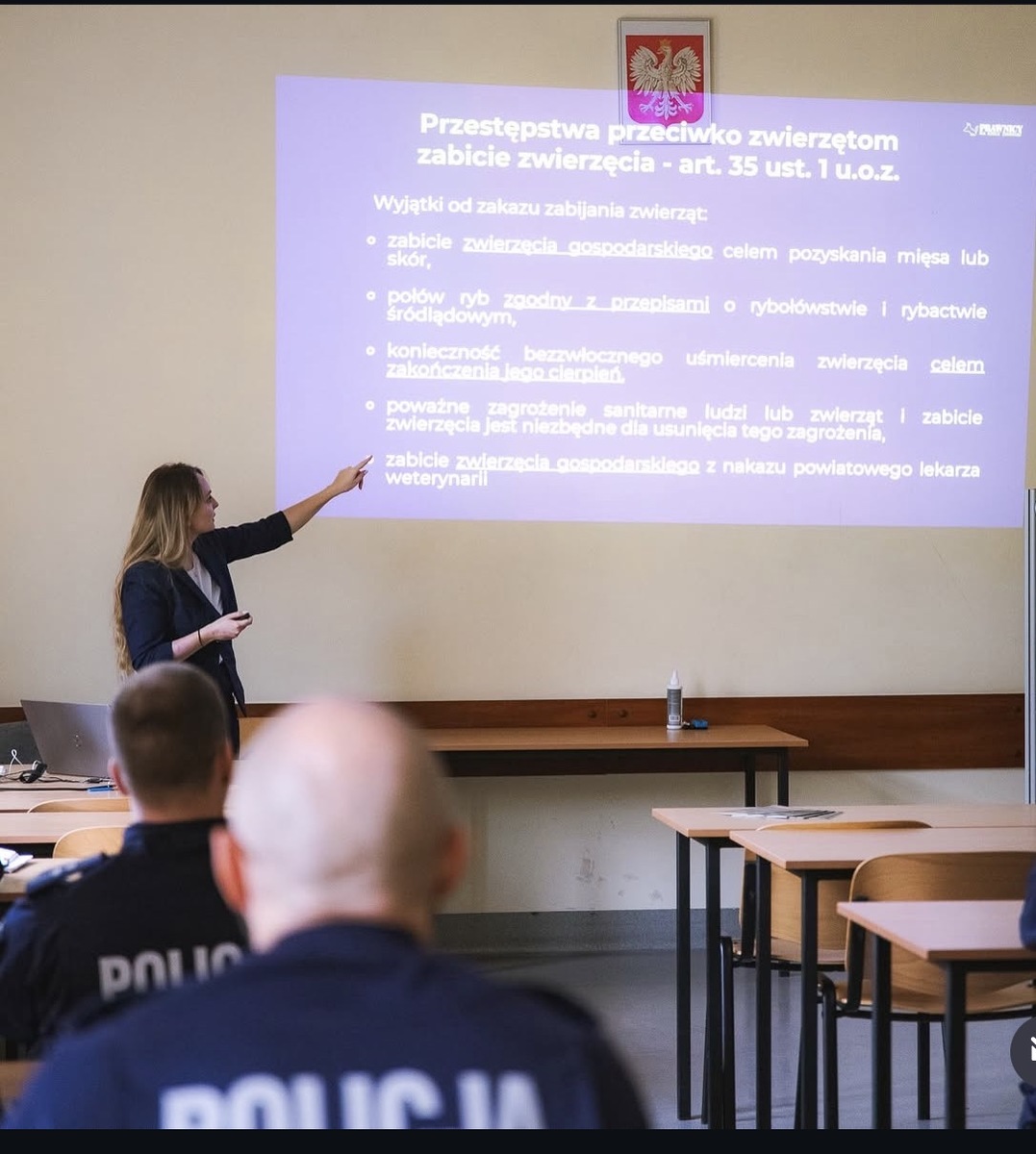 W dniu 22 października br. fundacja „Prawnicy dla zwierząt” w osobie Pani wiceprezes Marii Januszczyk z sukcesem przeprowadziła szkolenie dotyczące ustawy z dnia 21 sierpnia 1997 roku o ochronie zwierząt o ochronie zwierząt. W wydarzeniu, które odbyło się w naszej jednostce wzięło udział kilkunastu nauczycieli policyjnych z Zakładów Kryminalnego, Ruchu Drogowego, Prewencji i Szkoleń Specjalnych.