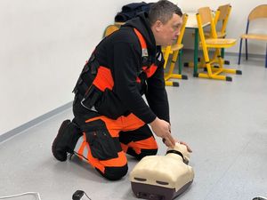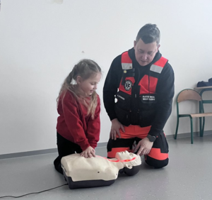 Istotnym elementem spotkania była również rozmowa na temat pierwszej pomocy. Zaprezentował dzieciom podstawowe zasady udzielania pomocy oraz pokazał, jak prawidłowo wykonać resuscytację krążeniowo-oddechową. Dodatkowo przedstawił sposób postępowania w przypadku zadławienia i zakrztuszenia, co spotkało się z dużym zainteresowaniem najmłodszych. Najmłodsi z ogromnym zaangażowaniem uczestniczyli w zajęciach i mieli okazję samodzielnie spróbować wykonać resuscytację na specjalnym fantomie.