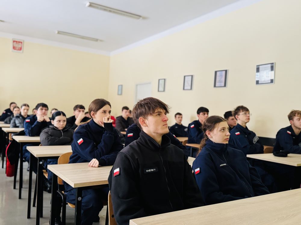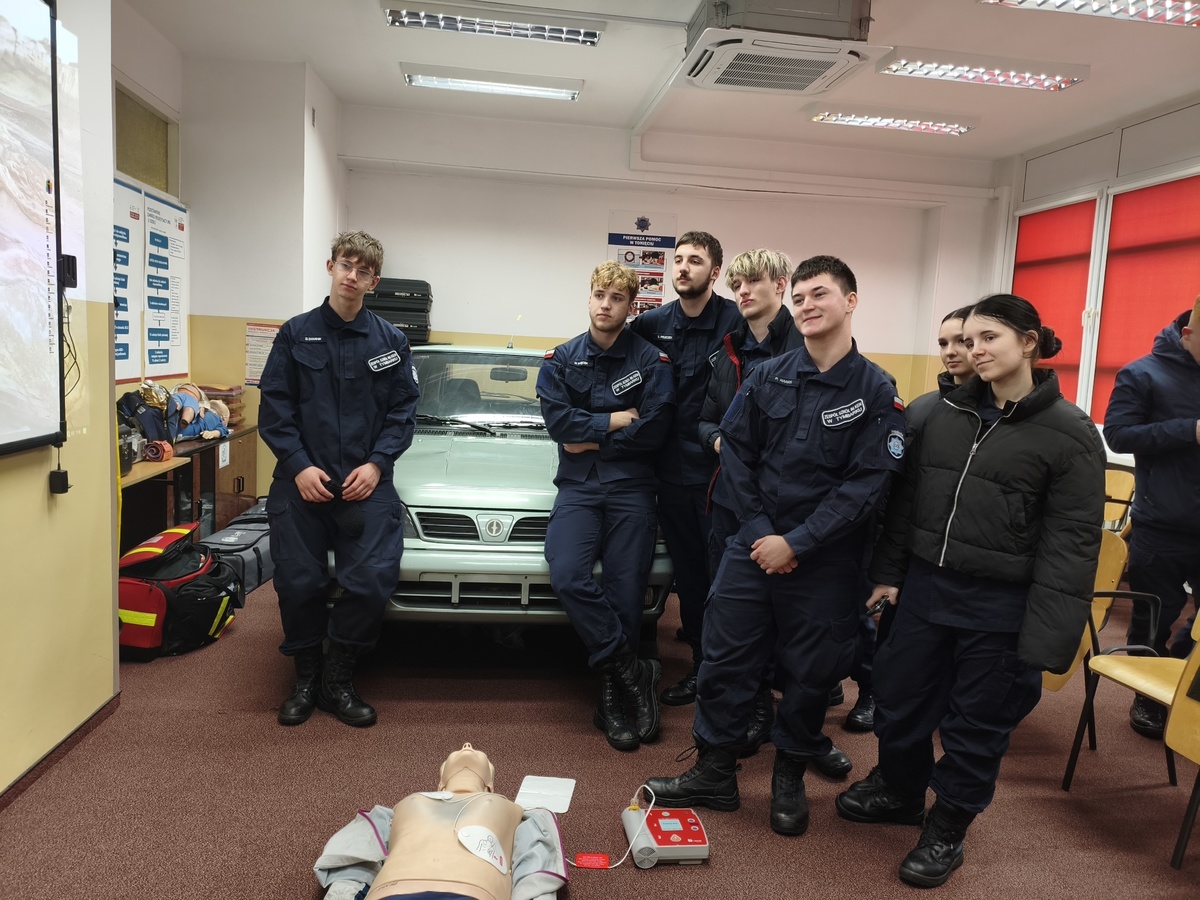 Kolejnym etapem wizyty było spotkanie w Zakładzie Szkoleń Specjalnych. W specjalistycznej pracowni odbył się pokaz udzielania pierwszej pomocy przedmedycznej, który przeprowadził ratownik medyczny asp. szt. Krystian Szymański. Uczniowie mogli zapoznać się z podstawowymi zasadami postępowania w sytuacjach zagrożenia życia i zdrowia.