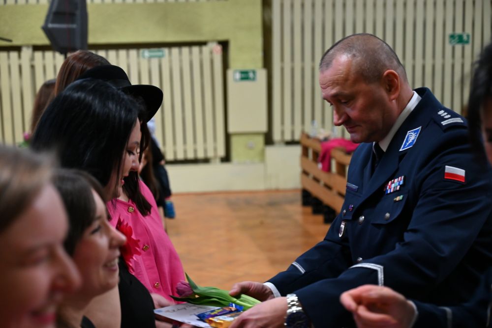 Następnie Komendant Centrum Szkolenia Policji w Legionowie insp. Robert Żółkiewski wspólnie ze swoim Zastępcą insp. Tomaszem Rylskim oraz Naczelnikiem Wydziału Dowodzenia mł. insp. Jakubem Piotrowskim wręczyli wszystkim Paniom upominki – słodkości oraz kwiaty – składając serdeczne życzenia zdrowia, pomyślności i wielu sukcesów zarówno w życiu zawodowym, jak i prywatnym.