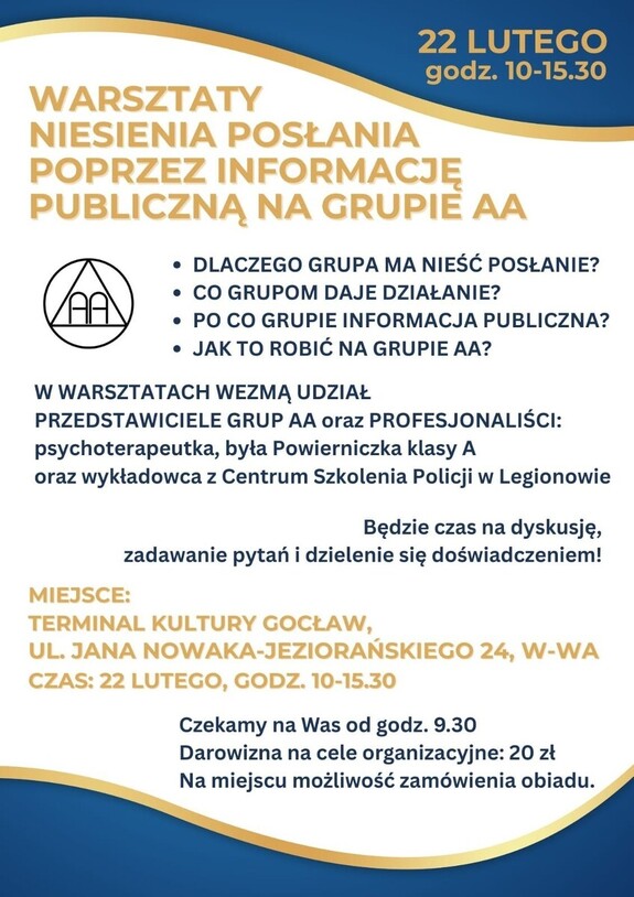 22 lutego 2026 roku w Terminalu Kultury Gocław w Warszawie odbyły się regionalne „Warsztaty niesienia posłania poprzez informację publiczną na grupie AA”. W wydarzeniu uczestniczyło około 85 osób – przedstawiciele Wspólnoty Anonimowych Alkoholików oraz profesjonaliści na co dzień zaangażowani w pomoc osobom zmagającym się z uzależnieniem od alkoholu. Wśród zaproszonych prelegentów znalazła się kom. Dorota Kozłowska – starszy wykładowca Zakładu Prewencji Centrum Szkolenia Policji, która wystąpiła w drugim i czwartym panelu dyskusyjnym.
