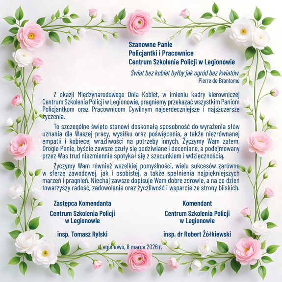 Komendant Centrum Szkolenia Policji w Legionowie wraz z Zastępcą składają najserdeczniejsze życzenia z okazji Dnia Kobiet