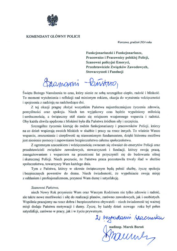 Komendant Główny Policji gen. insp. Marek Boroń zwraca się do policjantek i pracownic cywilnych Policji, przekazując najserdeczniejsze życzenia z okazji Dnia Kobiet.
