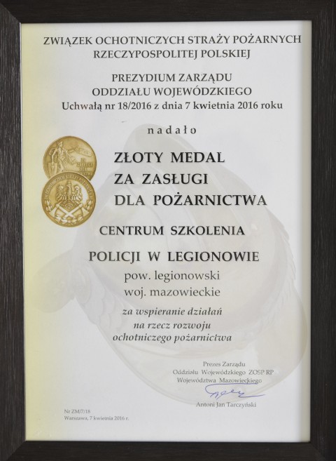Centrum Szkolenia Policji zostało wyróżnione Złotym Medalem za Zasługi dla Pożarnictwa. To podsumowanie wieloletniej doskonałej współpracy z legionowską Ochotniczą Strażą Pożarną i Komendą Powiatową PSP w Legionowie, a także pozostałymi jednostkami OSP z terenu powiatu.