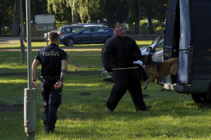 − asp. Tomasz Kozielecki z psem Radin z KWP w Bydgoszczy.