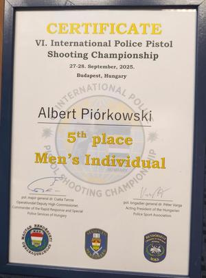 Kom. Albert Piórkowski z Zakładu Interwencji Policyjnych Centrum Szkolenia Policji w Legionowie odniósł ogromny sukces, zajmując 5. miejsce w klasyfikacji indywidualnej podczas VI Międzynarodowych Mistrzostw Policji w strzelaniu z pistoletu, które odbyły się w dniach 26–27 września 2025 roku w Budapeszcie.