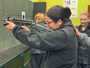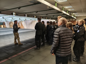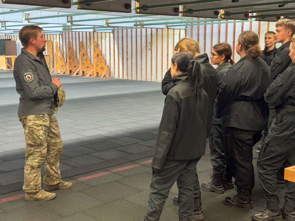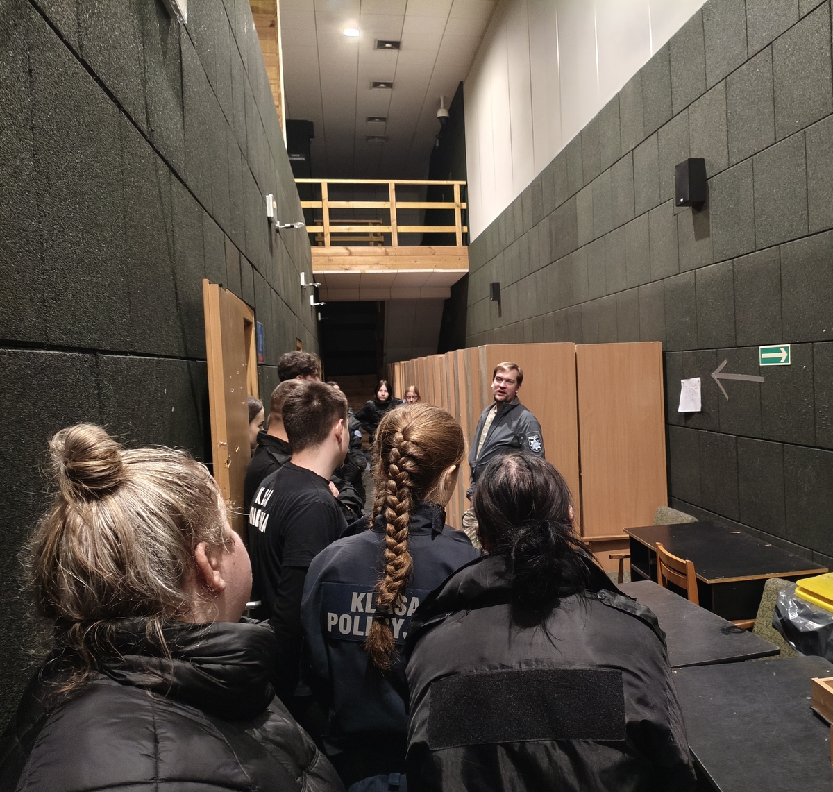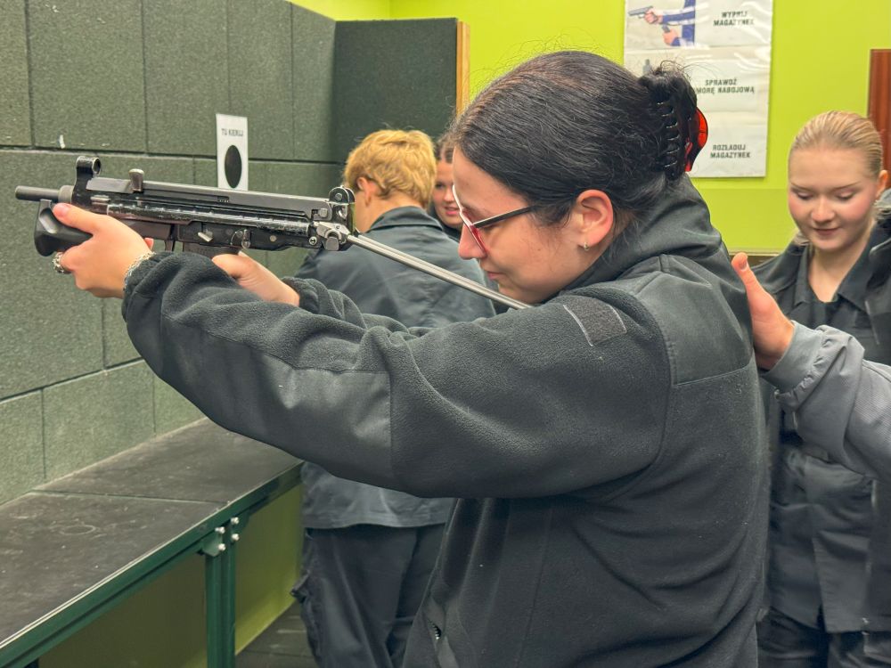 Instruktor z Zakładu Interwencji Policyjnych mł. asp. Marcin Załuga zapoznał uczniów z nowoczesnymi obiektami zespołu strzelnic oraz wprowadził w tajniki wyszkolenia strzeleckiego.