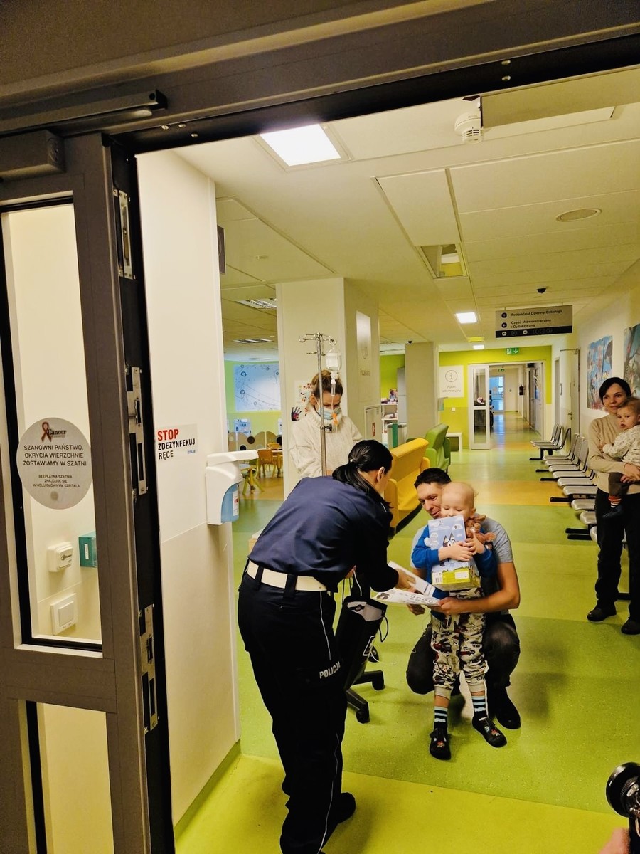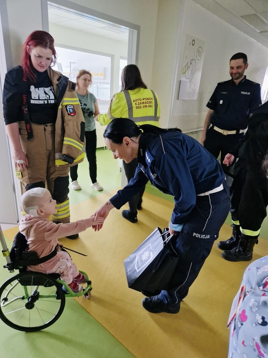 Policjanci z Zakładu Ruchu Drogowego CSP w Legionowie: asp. szt. Beata Spinek, asp. Katarzyna Stępień, asp. Cezary Grabowski oraz podkom. Piotr Jezierski, wspólnie z druhami OSP Kobyłka i funkcjonariuszami „BOA”, w porozumieniu z personelem medycznym, odwiedzili dzieci bezpośrednio na oddziałach. Podczas spotkań mundurowi rozmawiali z najmłodszymi o podstawowych zasadach bezpieczeństwa oraz przypomnieli o numerze alarmowym 112.