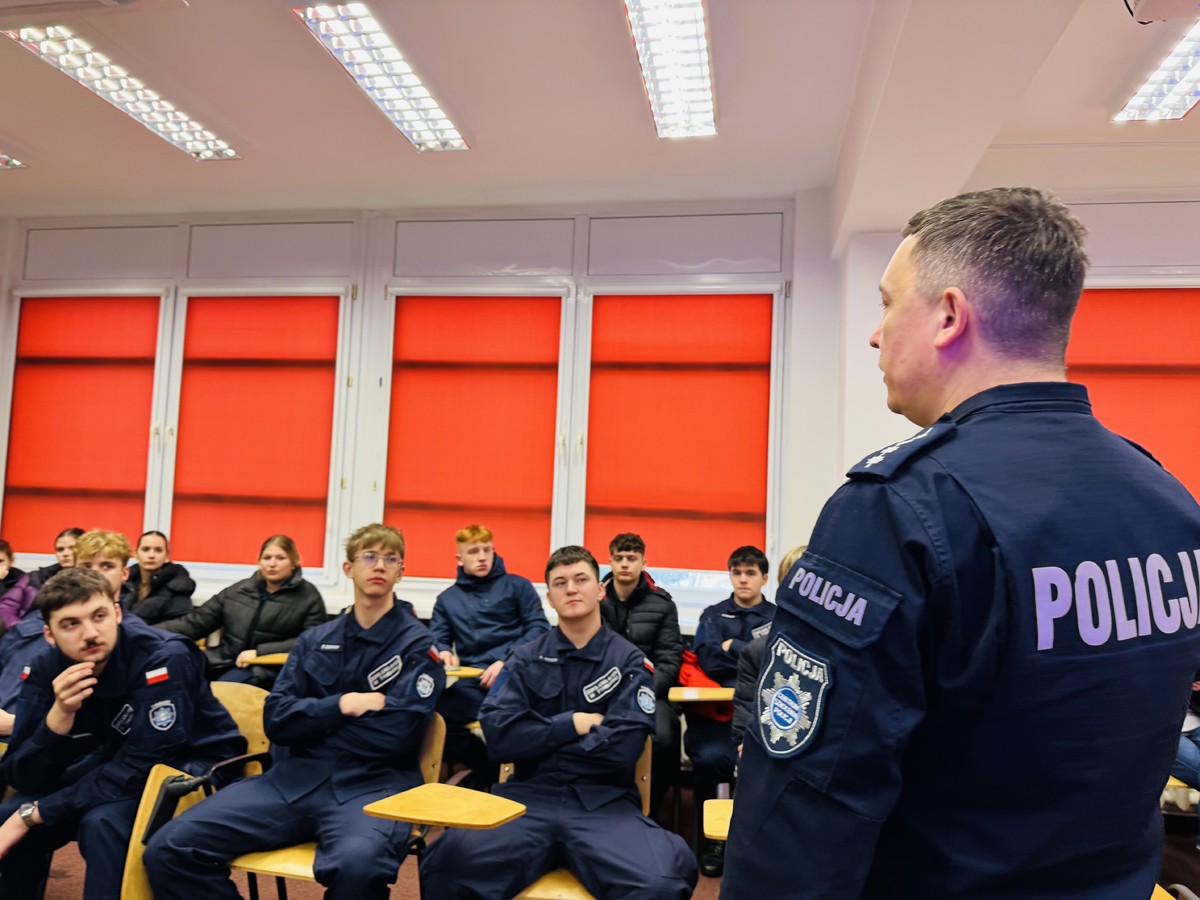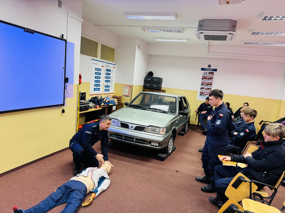 Kolejnym etapem wizyty było spotkanie w Zakładzie Szkoleń Specjalnych. W specjalistycznej pracowni odbył się pokaz udzielania pierwszej pomocy przedmedycznej, który przeprowadził ratownik medyczny asp. szt. Krystian Szymański. Uczniowie mogli zapoznać się z podstawowymi zasadami postępowania w sytuacjach zagrożenia życia i zdrowia.