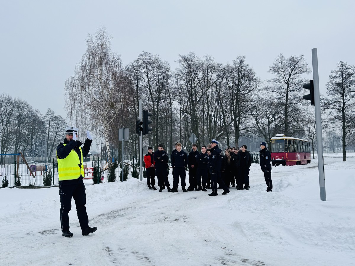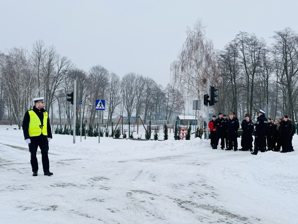 Pierwszym punktem programu było zapoznanie uczniów z działalnością Zakładu Ruchu Drogowego. Policjanci: asp. szt. Beata Spinek, asp. Cezary Grabowski, podkom. Marcin Gąsior oraz podkom. Piotr Jezierski przybliżyli młodzieży zadania wykonywane przez funkcjonariuszy ruchu drogowego oraz zaprezentowali sprzęt wykorzystywany w codziennej służbie. Uczniowie uczestniczyli także w pokazie przeprowadzonym w sali luster oraz na skrzyżowaniu znajdującym się na terenie Centrum, które odzwierciedla rzeczywiste warunki drogowe.