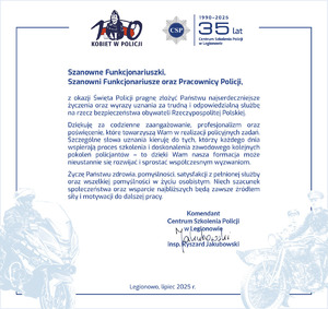 Komendant Centrum Szkolenia Policji w Legionowie insp. Ryszard Jakubowski wszystkim funkcjonariuszkom, funkcjonariuszom i pracownikom cywilnym Policji składa życzenia z okazji Święta Policji.